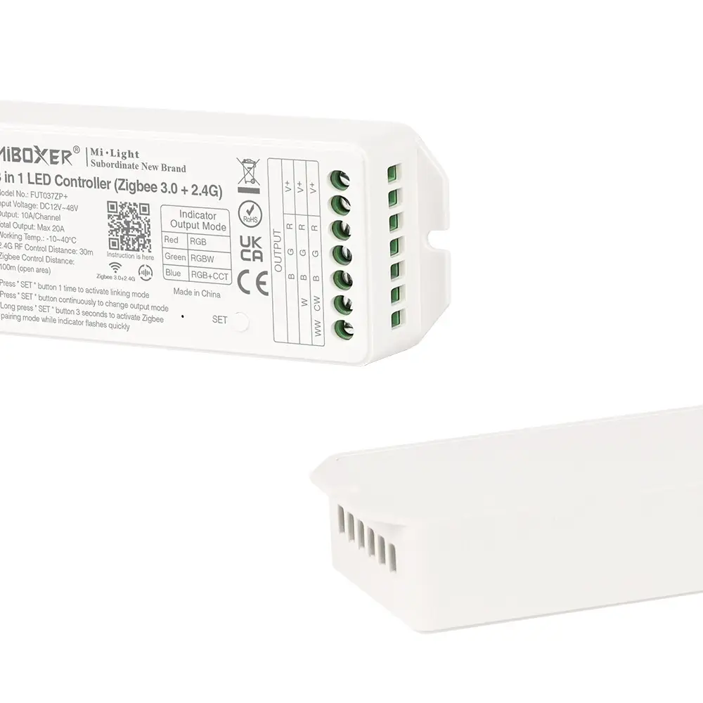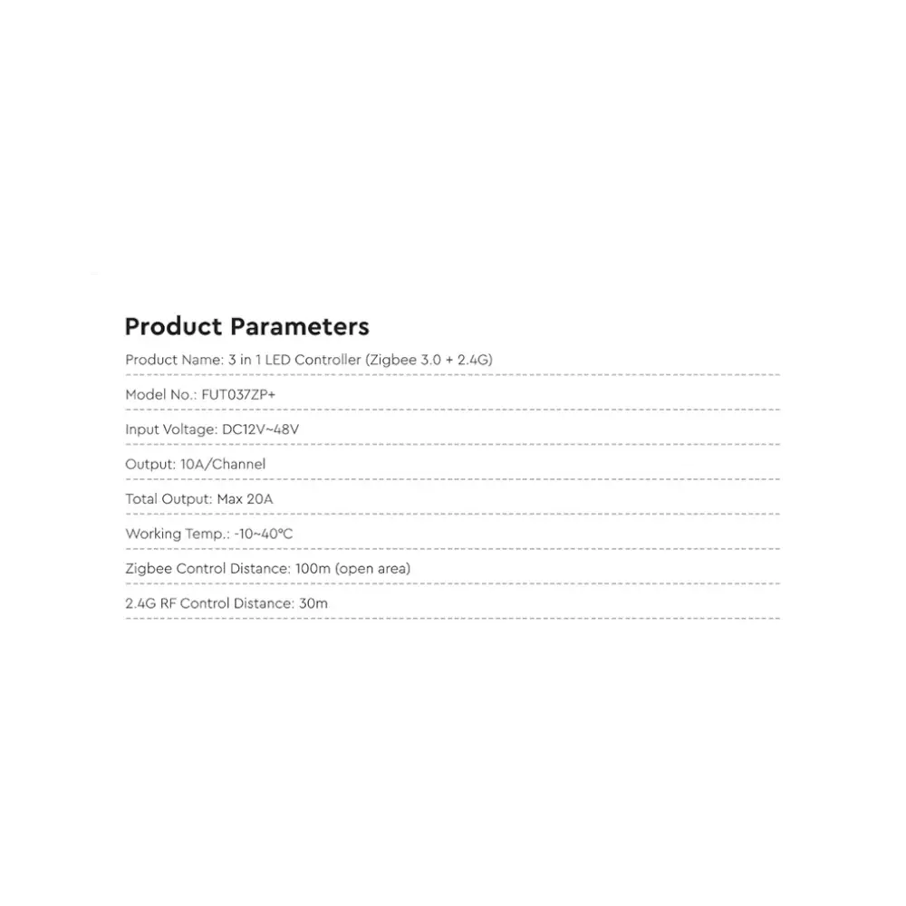 The FUT037ZP+ controller is an advanced device that allows for the control of LED lighting. With Zigbee 3.0 support, it provides wireless connectivity to other devices in the network, enabling easy lighting management in homes or offices.