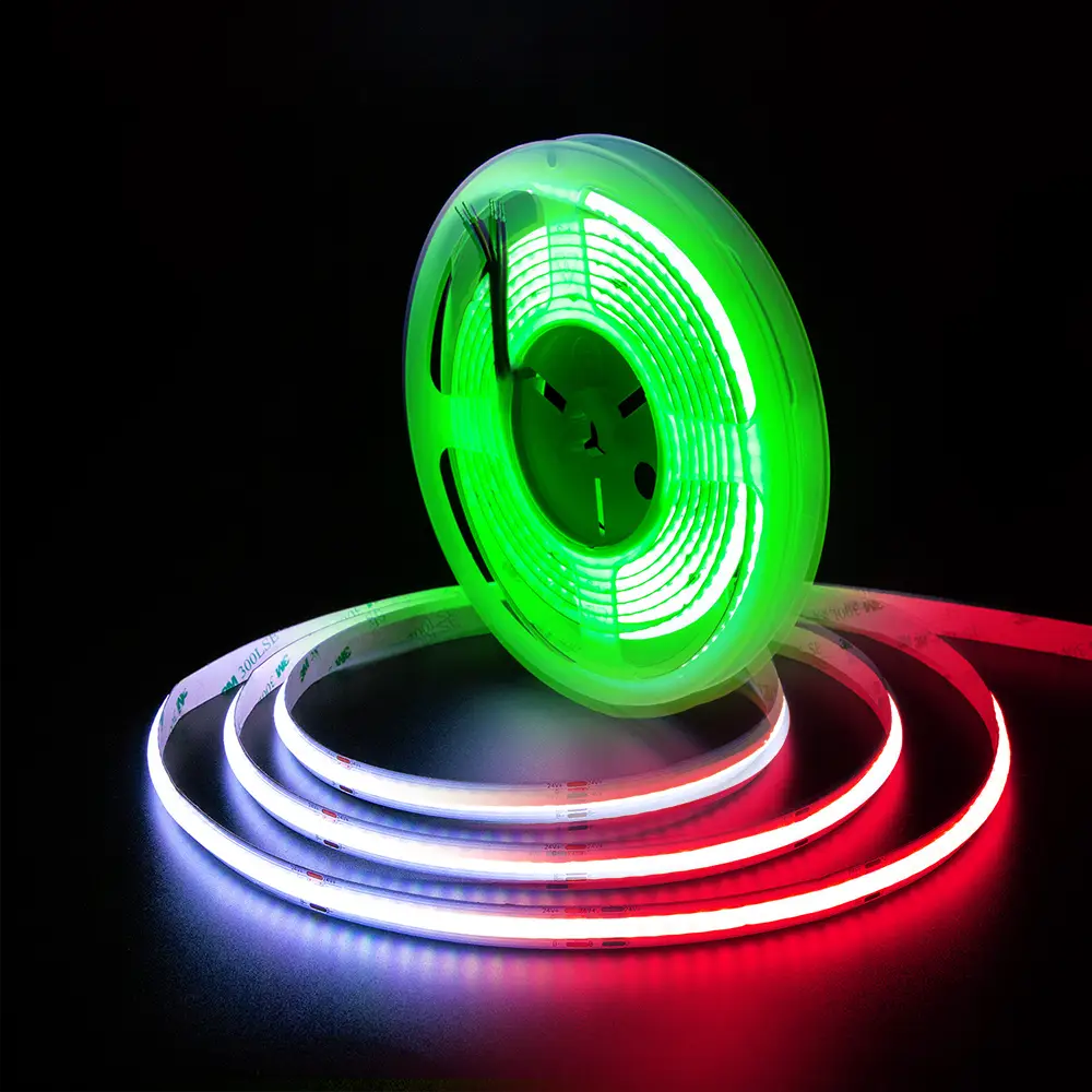 Taśma LED COB RGB 576 LED/m to wyważone rozwiązanie łączące jednolitą linię światła, stabilność 24 V i łatwość montażu, dzięki czemu doskonale sprawdzi się w profesjonalnych instalacjach sufitowych, meblarskich i reklamowych.