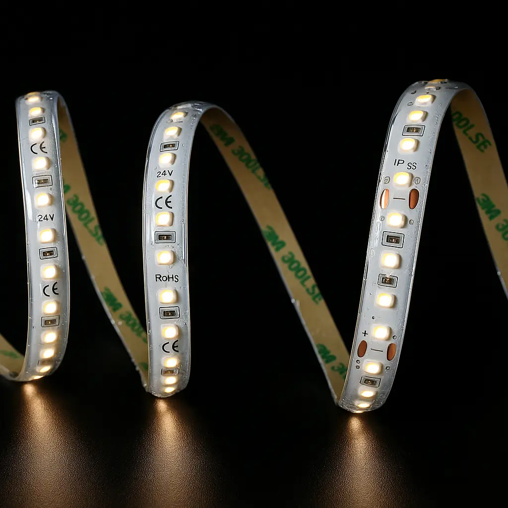 Светодиодная лента с плотностью 140 светодиодов на метр во влагозащищенном исполнении IP65 – это, самое главное, безопасный выбор для кухонь, ванных комнат, гаражей или крытых террас. В отличие от версии IP20, светодиоды заключены в гибкую смолу, поэтому защищены от пыли и брызг.